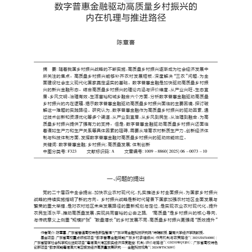 最近,我院陈章喜教授以独立作者身份在《江苏行政学院学报》2025年第6期发表题为《数字普惠金融驱动高质量乡村振兴的内在机理与推进路径》的理论文章。文章认为,高质量乡村振兴能够补齐农村发展短板,深度解决“三农”问题,为全面建设社会主义现代化国家奠定坚实的基础,数字普惠金融作为高质量乡... [详细] |