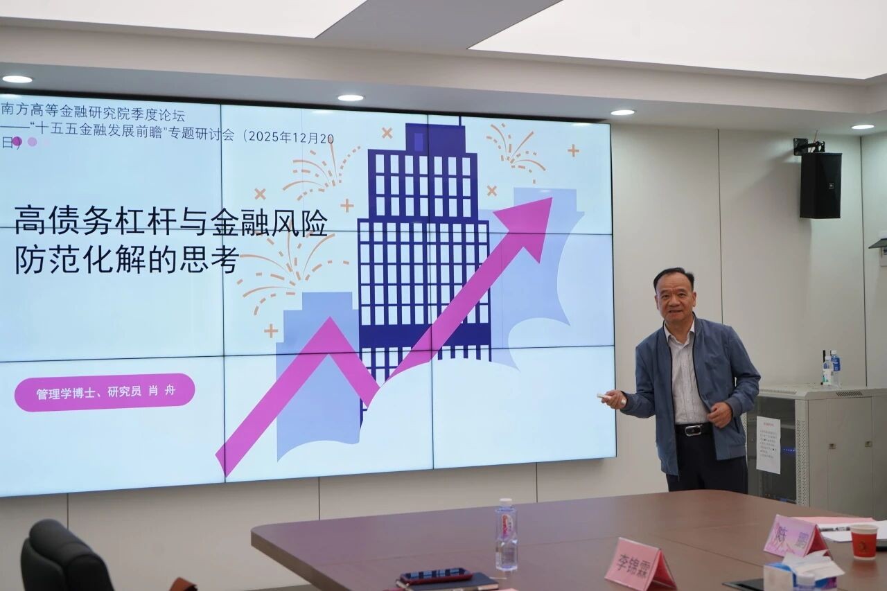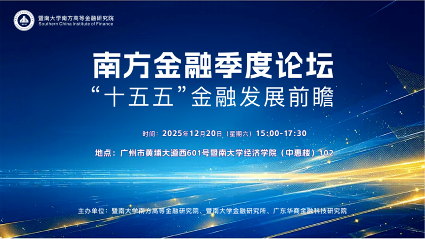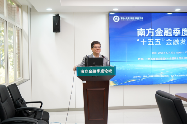 2025年12月20日下午,由暨南大学南方高等金融研究院、暨南大学金融研究所与广东华商金融科技研究院联合主办的南方金融季度论坛——“‘十五五’金融发展前瞻”专题研讨会于暨南大学经济学院中惠楼102顺利举行。本次论坛旨在深入学习领会二十届四中全会精神,探讨“十五五”金融改革发展问题。出席论坛并作主旨演讲的嘉宾包括暨南大学校友李锦霖博士、广东省社会科学院财政金融研究所所长刘佳宁、原中国工商银行湖南省分行副行长肖舟、广东粤财基金管理有限公司总经理沈国飞等。
